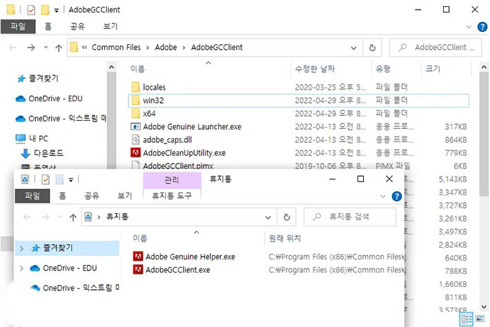 2. Adobe Genuine Helper.exe 와 AdobeGCClient.exe 파일을 삭제합니다.