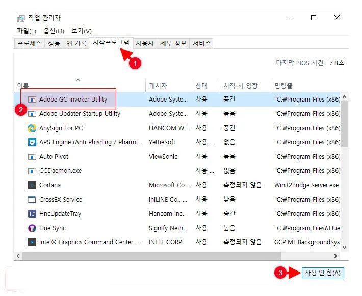 - 시작프로그램 목록에서 Adobe GC Invoker Utility를 찾아 클릭한 다음 우측 하단의 ‘사용 안