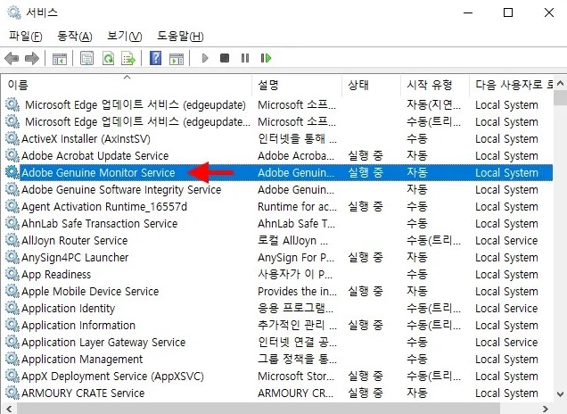 3. 서비스 목록에서 Adobe Genuine Monitor Service를 찾아 더블 클릭합니다.